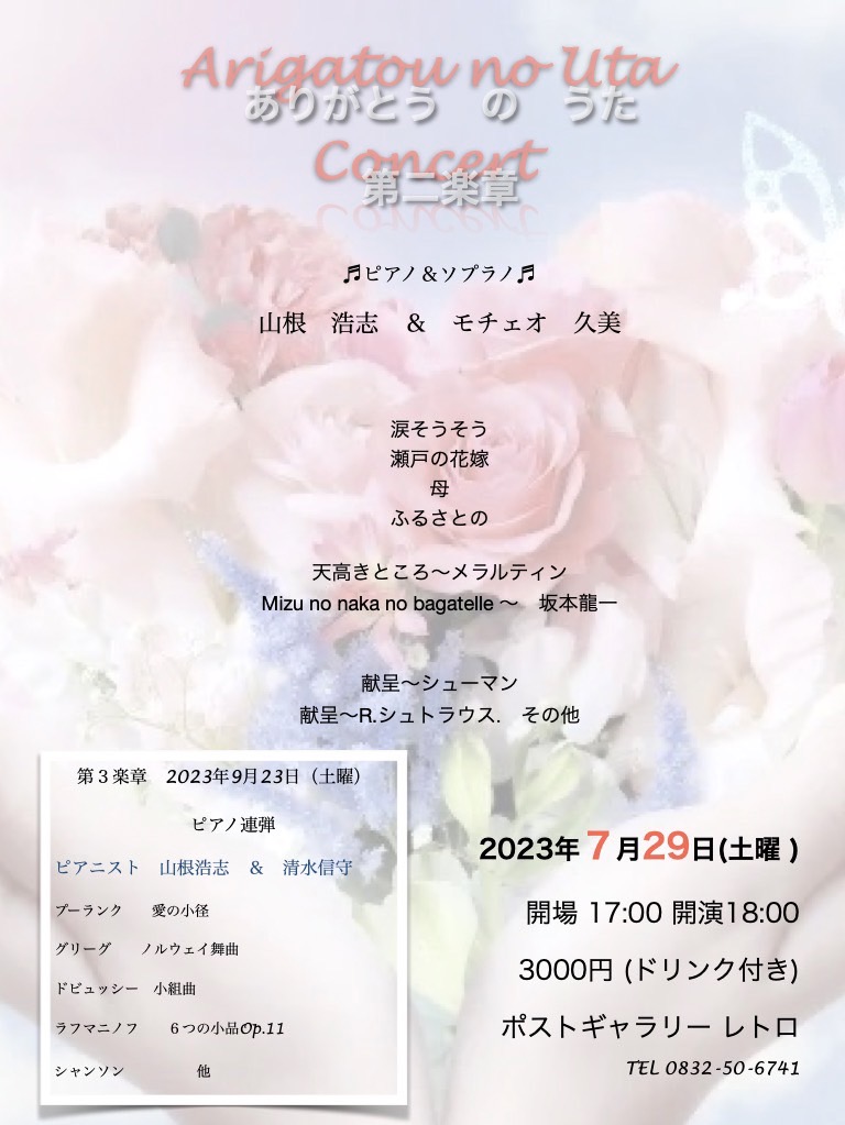 山根浩志&モチェオ久美 ありがとうのうた第2楽章 2023.07.21 イベント詳細 日付: 2023年7月29日 開場/17:00 開演/18:00 3,000円(ドリンク付き) 演奏曲 ・涙そうそう ・瀬戸の花嫁 ・母 ・ふるさとの ・天高きところ〜メラルティン ・Mizu no naka no bagatelle ・献呈〜シューマン ・献呈〜R.シュトラウス その他