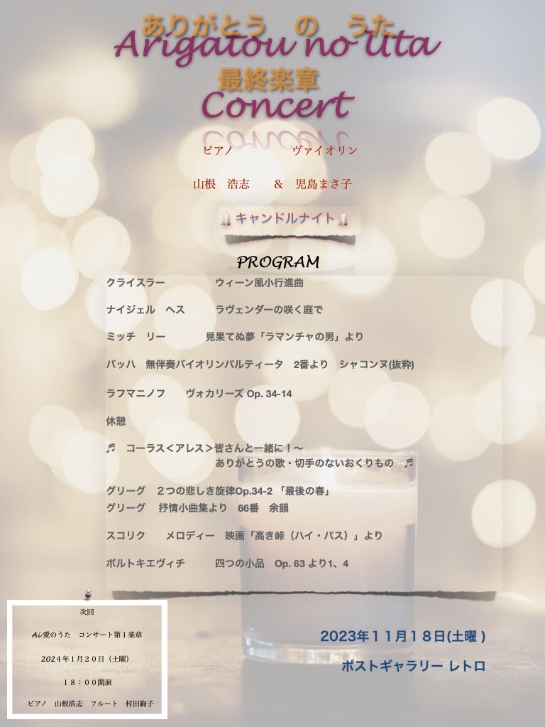 ありがとう の うた 最終楽章〜キャンドルナイト〜 2023.11.09 2023.07.21 イベント詳細 日付: 2023年11月18日 7:00 PM – 10:00 PM 会場: ポストギャラリーレトロ Piano 山根 浩志 Violin 児島 まさ子 3,000円(1ドリンク付)